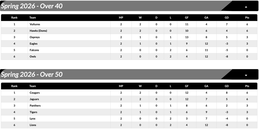 All of the games in the Over 35/40 Division were highly competitive this week. The early match featured two teams from the top half of the table, the Hawks/Doms and the Ospreys, going head-to-head. The Ospreys held the lead at halftime, but the Hawks/Doms rallied in the second half to take a 5–4 win, moving into 2nd place in the table with a 2–0 record.